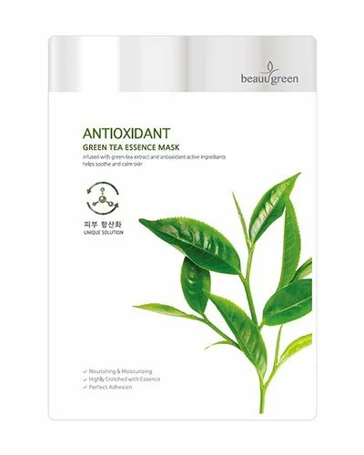 Антиоксидантная тканевая маска Antioxidant Green Tea Essence Mask от косметической марки BeauuGreen предназначена для защиты кожи от раннего старения, восстановления и омоложения кожных покровов лица. Основной действующий компонент сыворотки, пропитывающей ткань, это натуральный экстракт зеленого чая. Он быстро успокаивает и увлажняет, мягко тонизирует и очищает ткани от токсинов. Природные антиоксиданты чая, особенно в сочетании с пантенолом, аллантоином, коллагеном, действуют бережно и надежно. За небольшое время, пока маска контактирует с кожей, лицо становится заметно более свежим, подтянутым. Уход запускает процесс естественного обновления, разглаживает рельеф кожи, выравнивает цвет.
